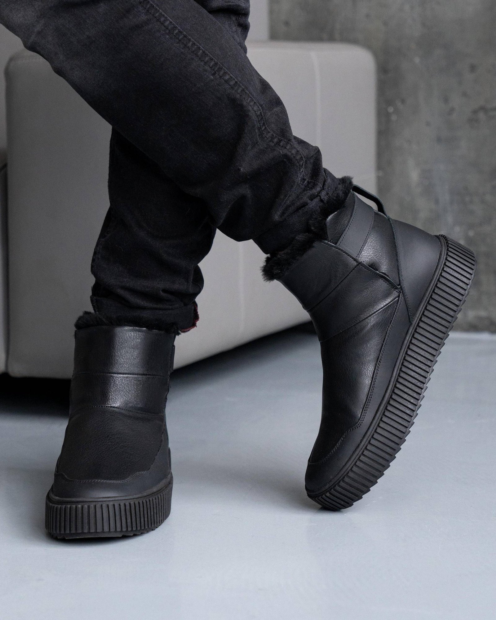 Верх виготовлений з натуральної шкіри, що забезпечує довговічність і стійкість до зношування. Усередині використовується натуральне хутро (овчина), яке ефективно зберігає тепло та підтримує комфортний мікроклімат у холодну погоду.